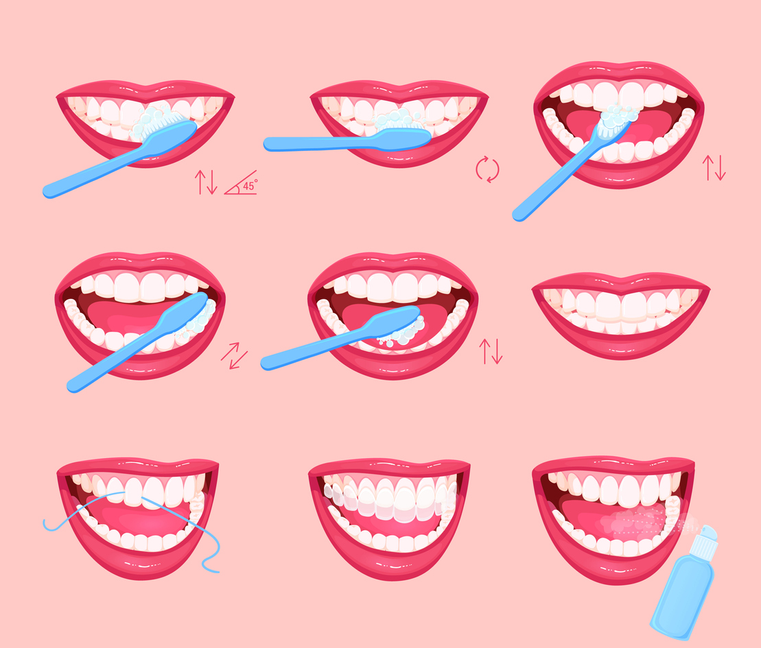 - Brush the top teeth down and the bottom teeth up. Do not forget to brush the palate and your tongue.